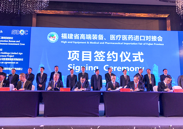 在福建省交易团举办的福建省高端设备、医疗医药进口对接会签约现场,福建圣农发展股份有限公司与安迪苏生命科学制品(上海)有限公司正式签约蛋氨酸项目。