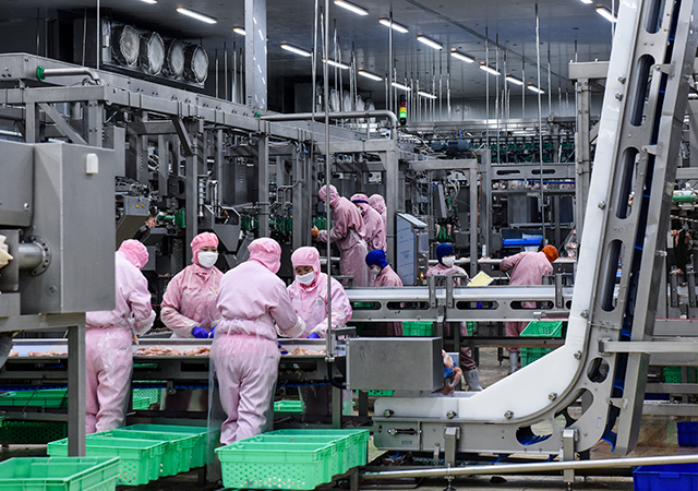 “以前在肉鸡从运鸡车上卸下至鸡毛被打净的前处理区,卸鸡、分笼、电晕工序由人工操作,作业环境较脏需要经常清洗,工人劳动强度大,产品偶尔会产生淤血、断翅现象。”肉鸡加工事业部总经理张金龙介绍,从国外引进先进的活禽自动装卸、二氧化碳击晕系统后,改为自动卸鸡和二氧化碳击晕,大幅提升装鸡、卸鸡效率,降低运输过程中鸡只死亡率和鸡只淤血、断翅比例。